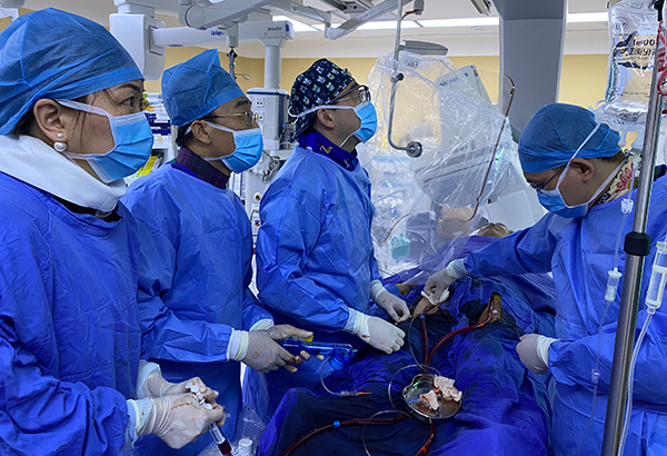 ECMO正常运转后,麻醉科副主任医师张晓红实施了镇痛镇静,心内科介入团队立即进行介入手术,仅仅用时一个小时即完成三支血管的完全血运重建,而心内科医生刘乐和贾衍尧就一直站在没有铅板遮挡的X线下持续的轮流按压右侧股动脉止血。手术结束时,血管外科主任杨永久调来股动脉压迫止血器终于止住出血。患者转运至ICU继续进行ECMO支持等综合监护治疗。