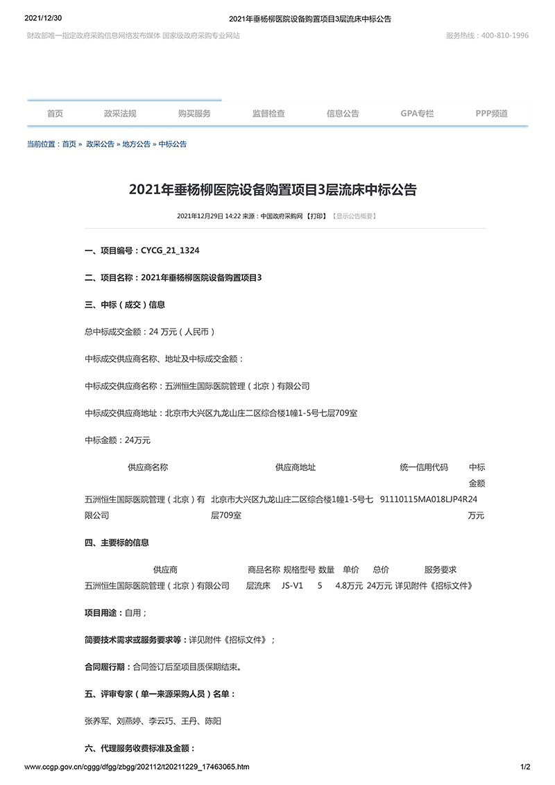 【转发】2021年垂杨柳医院设备购置项目3层流床中标公告
