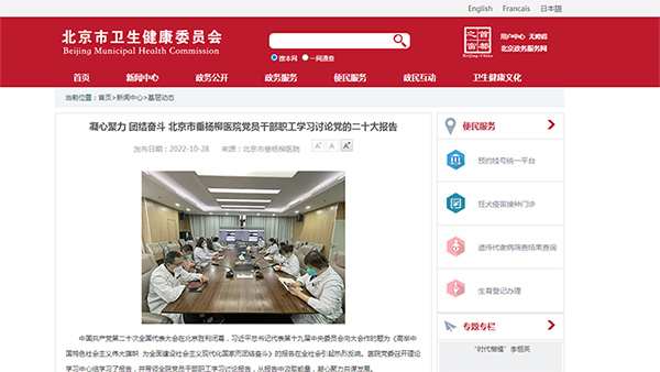 【媒体聚焦】北京市卫健委 | 凝心聚力 团结奋斗 北京市垂杨柳医院党员干部职工学习讨论党的二十大报告