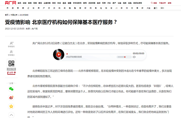 【媒体聚焦】央广网中国之声 | 受疫情影响 北京医疗机构如何保障基本医疗服务?