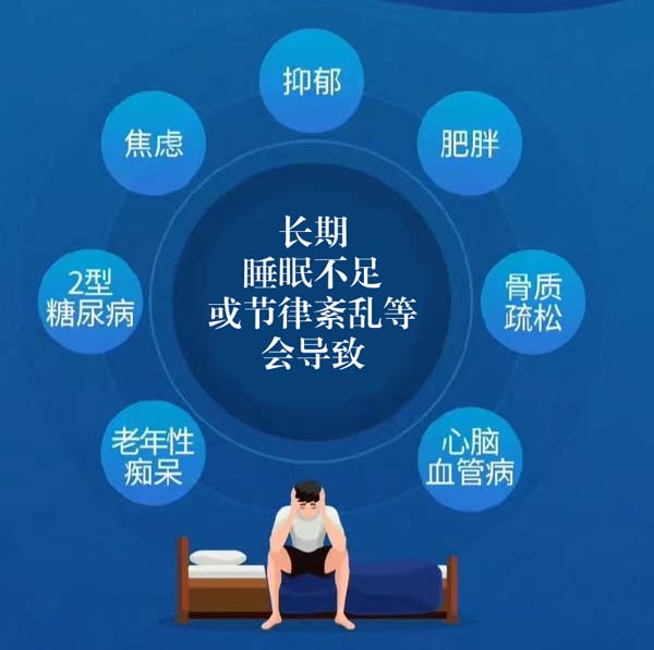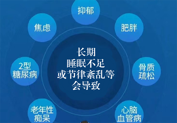 保证良好睡眠是患者身心健康的重要基础。长期睡眠不足或节律紊乱等会导致患者出现焦虑、抑郁等情绪问题,而且会导致心脑血管疾病、肥胖、糖尿病、老年痴呆、骨质疏松等一系列躯体问题。