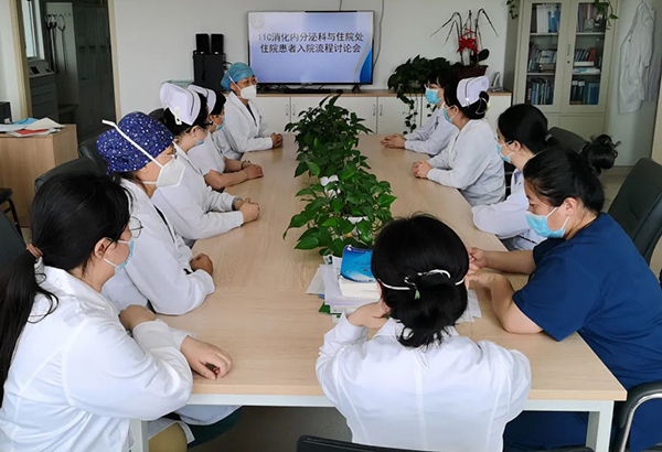 为改善服务流程,减少患者“堵车”,消化内科、内分泌科与住院处主任、护士长以及医护人员召开专题讨论会,从实际问题出发,完善《11C病区患者预约入院流程》,积极利用新媒体平台,建立医患沟通群、工作群,将门诊拟收入院的患者进行登记、排号,由门诊医生告知患者耐心在家等待医院通知。待床位有空余时,由科室医生统筹安排提前一日电话通知患者做好入院准备、注意事项及需要携带物品。在患者入院当日,病区和住院处通过工作群将当日入院患者名单进行交接、层层核对,待患者报到后即可办理入院手续。