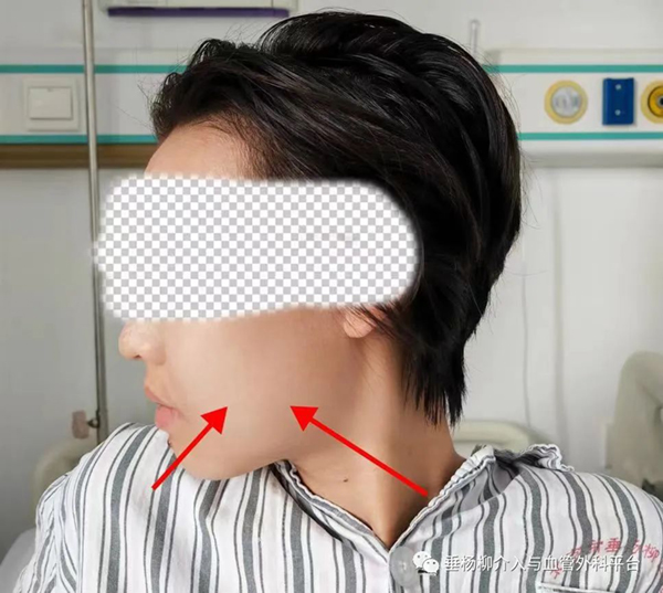 左下颌骨中心性血管瘤患者的头颈部增强CT显示颈外静脉增粗(箭头)