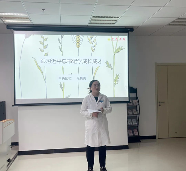 本次培训也邀请了中央团校的党委委员、党群工作部部长毛赟美做专题讲座。毛老师以《跟习近平总书记成长成才》为题,采用观看视频、现场互动的方式,带领团员青年回顾了习近平的青年岁月,并以贯穿于习近平青年时期的“理想、本领、担当、奋斗、品德”5个关键词为切入点,结合医疗行业青年现状,启示我们要以习总书记为榜样,做信念坚定、为民服务、勤劳务实、敢于担当的新时代好青年。