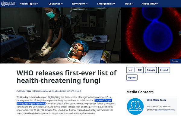 [2]https://www.who.int/news/item/25-10-2022-who-releases-first-ever-list-of-health-threatening-fungi