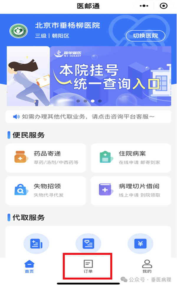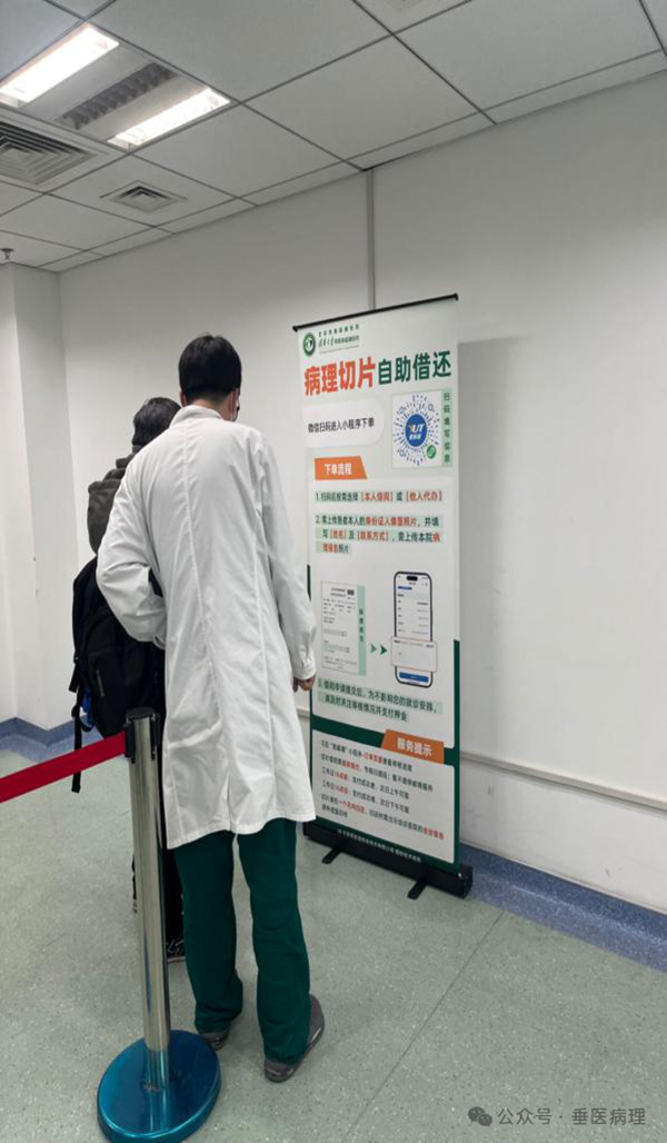 ③扫描病理科窗口易拉宝右上方二维码,关注“垂医病理”微信公众号,点击左下角按键切换至“切片借阅”,点击进入小程序;