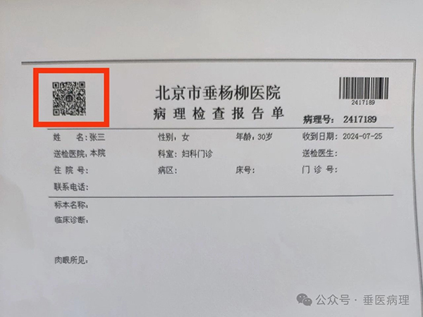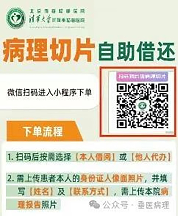①手中有病理报告单,扫描报告左上方二维码,关注“垂医病理”微信公众号,点击左下角按键切换至“切片借阅”,点击进入小程序;