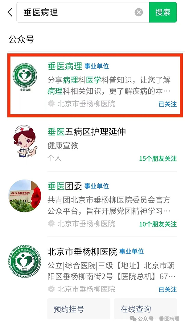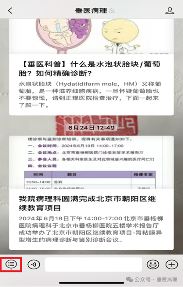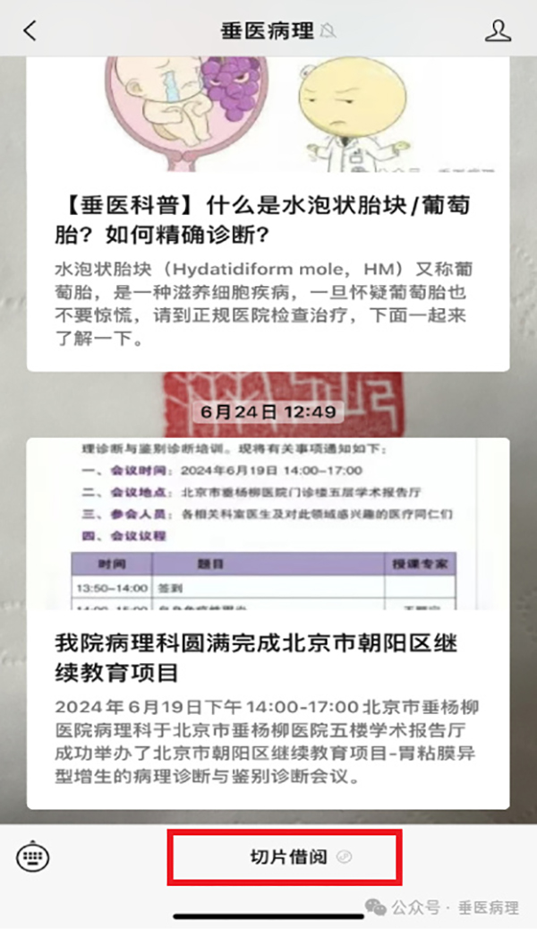 ④微信搜索“垂医病理”公众号,关注公众号,点击左下角按键切换至“切片借阅”,点击进入小程序。
