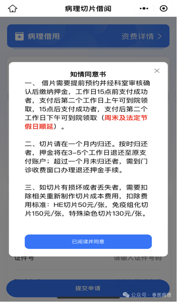 背景:病理科搬入新大楼后,工作量快速增加,同时病理标本种类和疑难程度也明显增加,患者借阅病理切片去外院会诊的需求也大幅增加,导致患者等待时间延长,同时借阅押金的收取及保存管理也面临较大挑战。