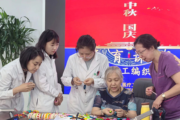 国庆节前夕,在朝阳区医疗卫生工会的大力支持下,医院工会举办了“织”绘非遗,共庆华诞传统绳结编织技艺美育课。