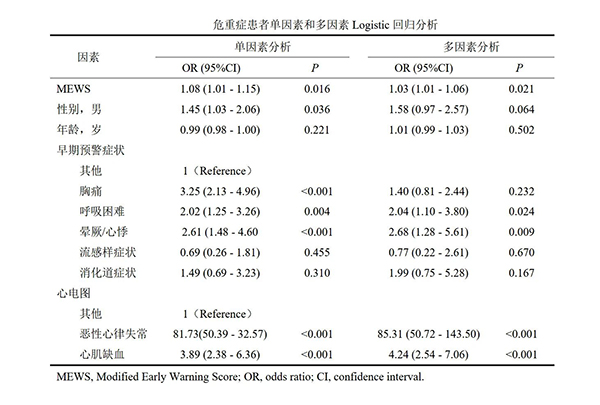 本研究发现,以IHCA(0=否,1=是)为因变量,将单因素分析有差异指标作为自变量,进行多因素logistics回归分析,结果显示,性别、年龄、MEWS、预警症状、心电图是影响危重症患者IHCA发生的危险因素(P<0.05)。