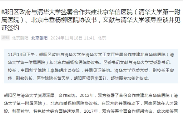 【媒体聚焦】北京朝阳 | 朝阳区政府与清华大学签署合作共建北京华信医院(清华大学第一附属医院)、北京市垂杨柳医院协议书,文献与清华大学领导座谈并见证签约