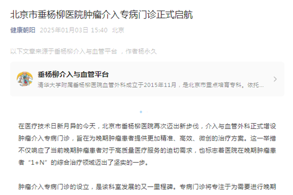 【媒体聚焦】健康朝阳 | 北京市垂杨柳医院肿瘤介入专病门诊正式启航