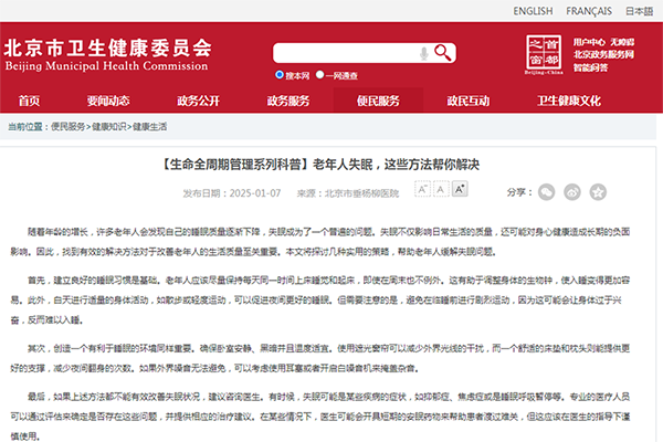 【媒体聚焦】【生命全周期管理系列科普】北京市卫生健康委员会 | 老年人失眠,这些方法帮你解决