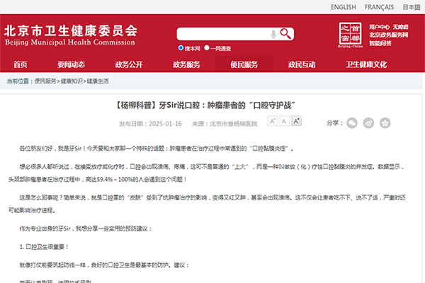 【媒体聚焦】【杨柳科普】北京市卫生健康委员会 | 牙Sir说口腔:肿瘤患者的“口腔守护战”
