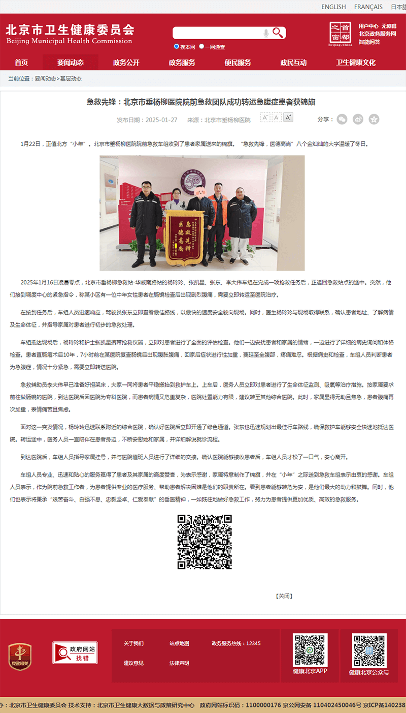 【媒体聚焦】北京市卫生健康委员会 | 急救先锋:北京市垂杨柳医院院前急救团队成功转运急腹症患者获锦旗