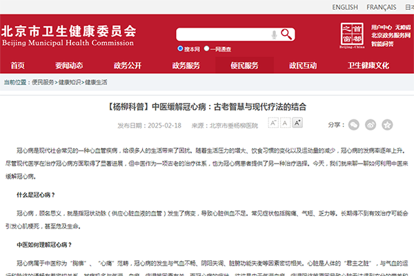 【媒体聚焦】【杨柳科普】北京市卫生健康委员会 | 中医缓解冠心病:古老智慧与现代疗法的结合