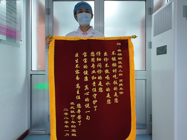 “不能按时吃饭的是您,出诊不敢喝水的是您,仔细问诊的是您。您用专业和责任守护了宝宝的健康。真心的说一句:医生不容易!高主任,您辛苦了!”这一面普通的锦旗,是医患情谊最朴素的表达;这一面特殊的锦旗,是七年如一日的真实写照。高捷心系患儿,精心治疗,暖心呵护,不仅赢得了患儿及家长的认可,更赢得了百姓信任,在群众心目中树立了医院儿科的“金名片”。高捷说:“我们面对的患儿是祖国的未来,是民族的希望。我们就要用更多的耐心和爱心,和更高的医疗技术运用到日常医疗服务当中,为患儿解除病痛,让孩子们迎接美好的未来。”