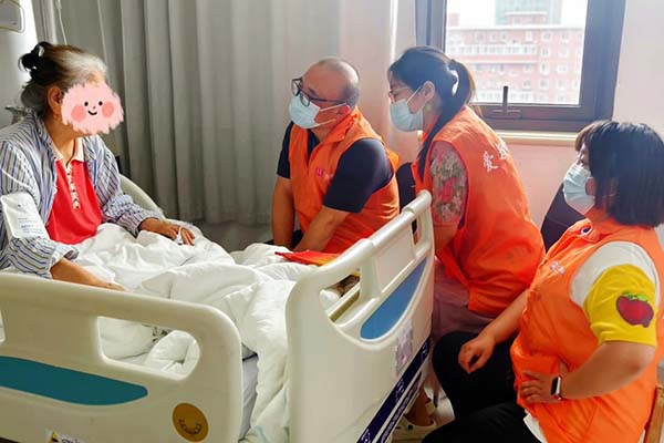 病房里,志愿者们分成小组开展服务,有的陪伴安宁疗护的患者,有的陪伴老年慢病的患者。患者高先生的故事让志愿者们感动到流泪;9床刘女士见有人陪伴她,高兴地从床上坐起来;48床的孙老听着志愿者给他唱歌,回忆起了年轻时在草原上的日子。