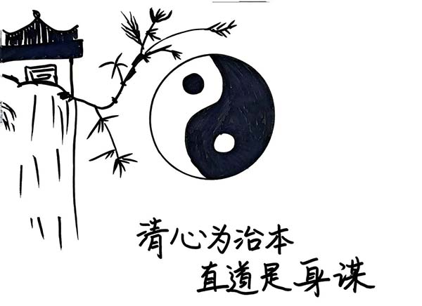 作品简介:这幅作品以太极黑白圈为核心,诠释廉洁深意。黑白融合的阴阳鱼,象征着正邪、廉贪始终对立依存,却又泾渭分明。如同廉洁与贪欲的博弈,唯有坚守内心的清正,方能如太极运转般平衡和谐,让纯净白驱散污浊黑,传递出坚守底线,弘扬廉洁正气的永恒主题。