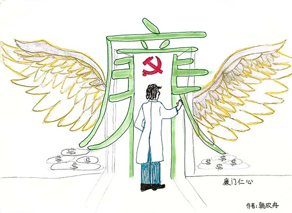 作品简介:作品以医疗行业为切入点,通过视觉象征构建"廉洁行医三重境界":破贪立廉(跨越金钱诱惑之门)、使命铸魂(党徽指引职业初心)、清风护航(廉洁之翼赋能新篇),将医疗反腐的现代命题融入传统门扇符号,以"推门入廉"的动作语言昭示:廉洁不是禁锢的牢笼,而是让仁心破茧成蝶的通途!