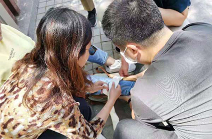 于是,他和妻子——医院体检中心护士陶玲云四处找夹板的替代品。最终在公园绿地里找到了几根废弃的硬木条,吴飞华和陶玲云就用这些硬木条,搭配一些白布带,为张女士进行了应急腿部固定。