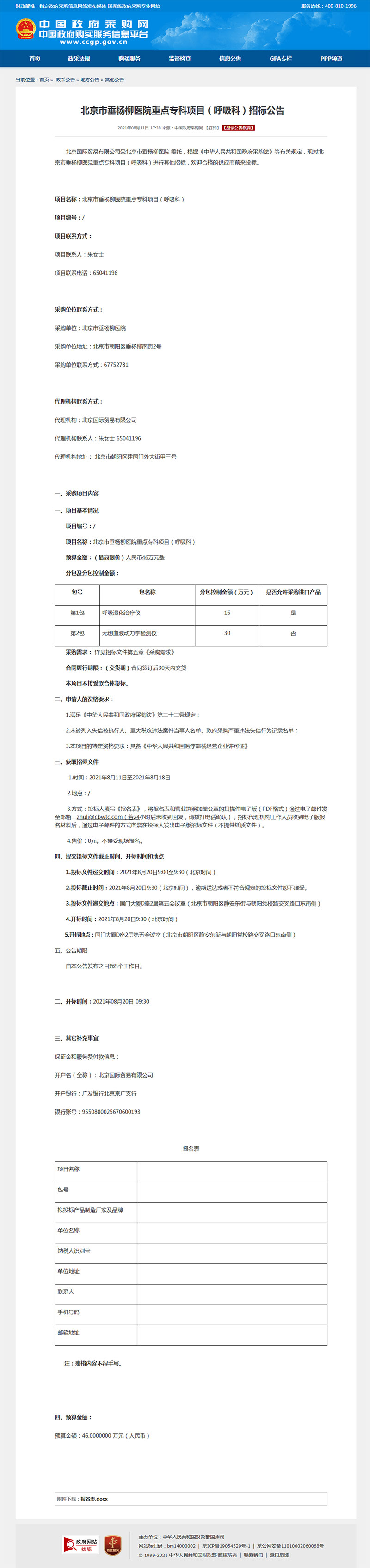 【转发】北京市垂杨柳医院重点专科项目(呼吸科)招标公告