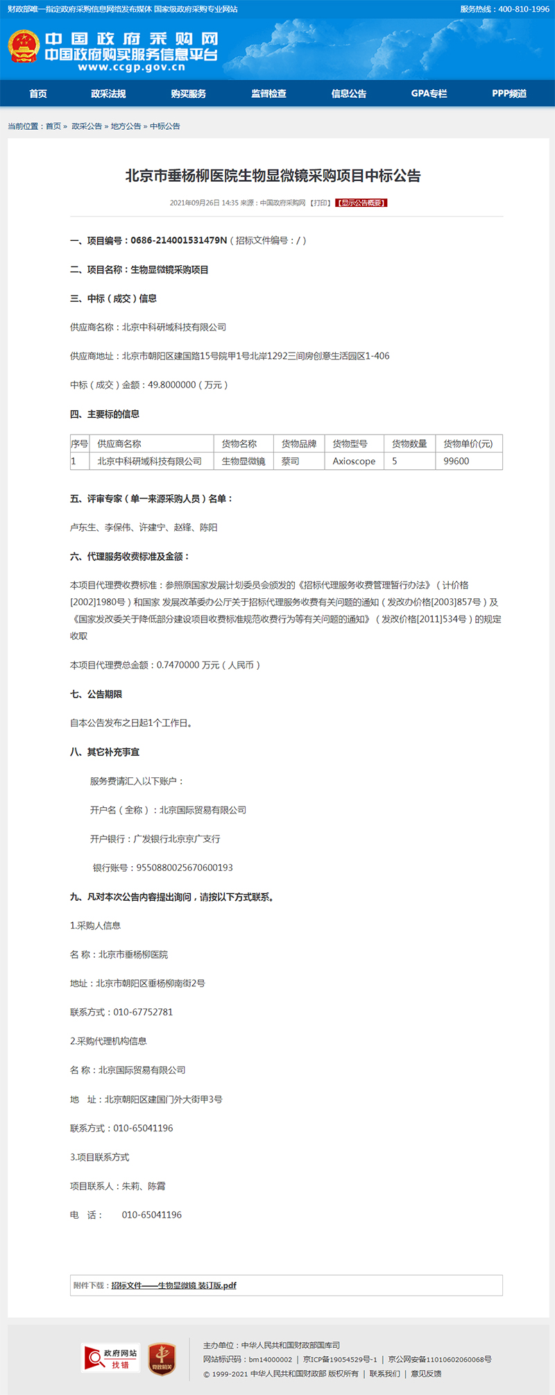 【转发】北京市垂杨柳医院生物显微镜采购项目中标公告